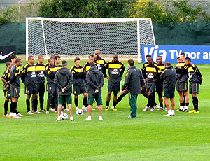 O treinador Dunga comandou seu primeiro coletivo na África do Sul, e Michel Bastos saiu na frente na briga com GIlberto pela lateral esquerda. O time titular não teve surpresas e, de colete vermelho, iniciou a atividade com Julio Cesar, Maicon, Juan, Lúcio e Michel Bastos; Gilberto Silva, Felipe Melo, Kaká e Elano; Robinho e Luis Fabiano. No time reserva, Gomes iniciou, enquanto Doni ficou no banco.